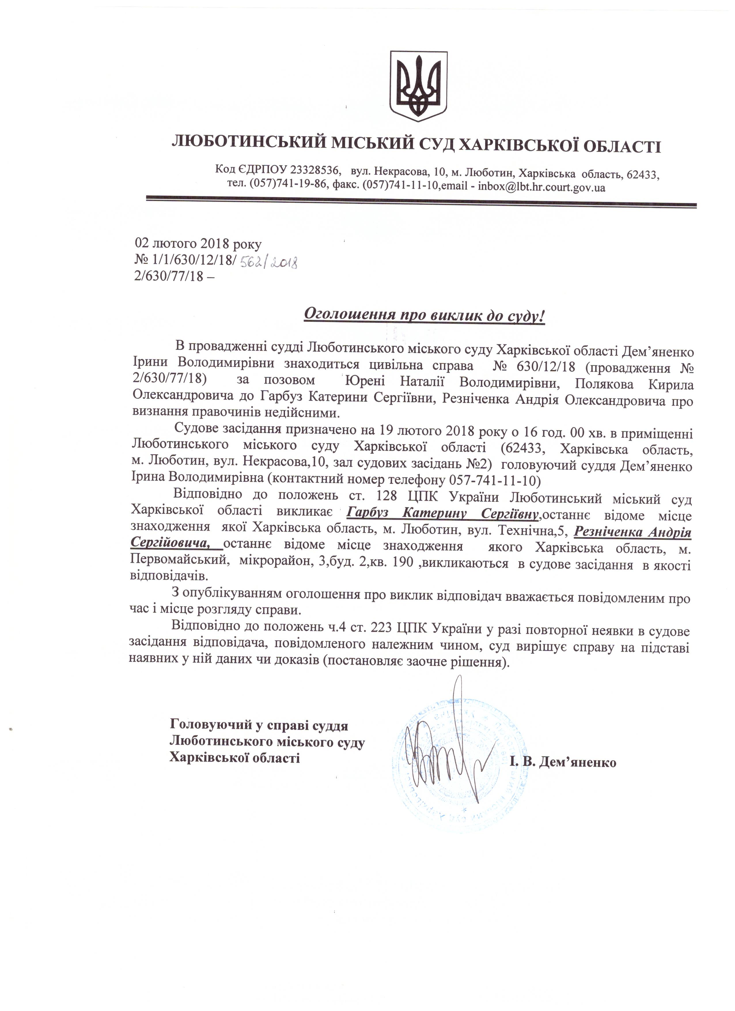 Оголошення про виклик до суду Гарбуз Катерину Сергіївну на 19.02.18 о 16-00 год.