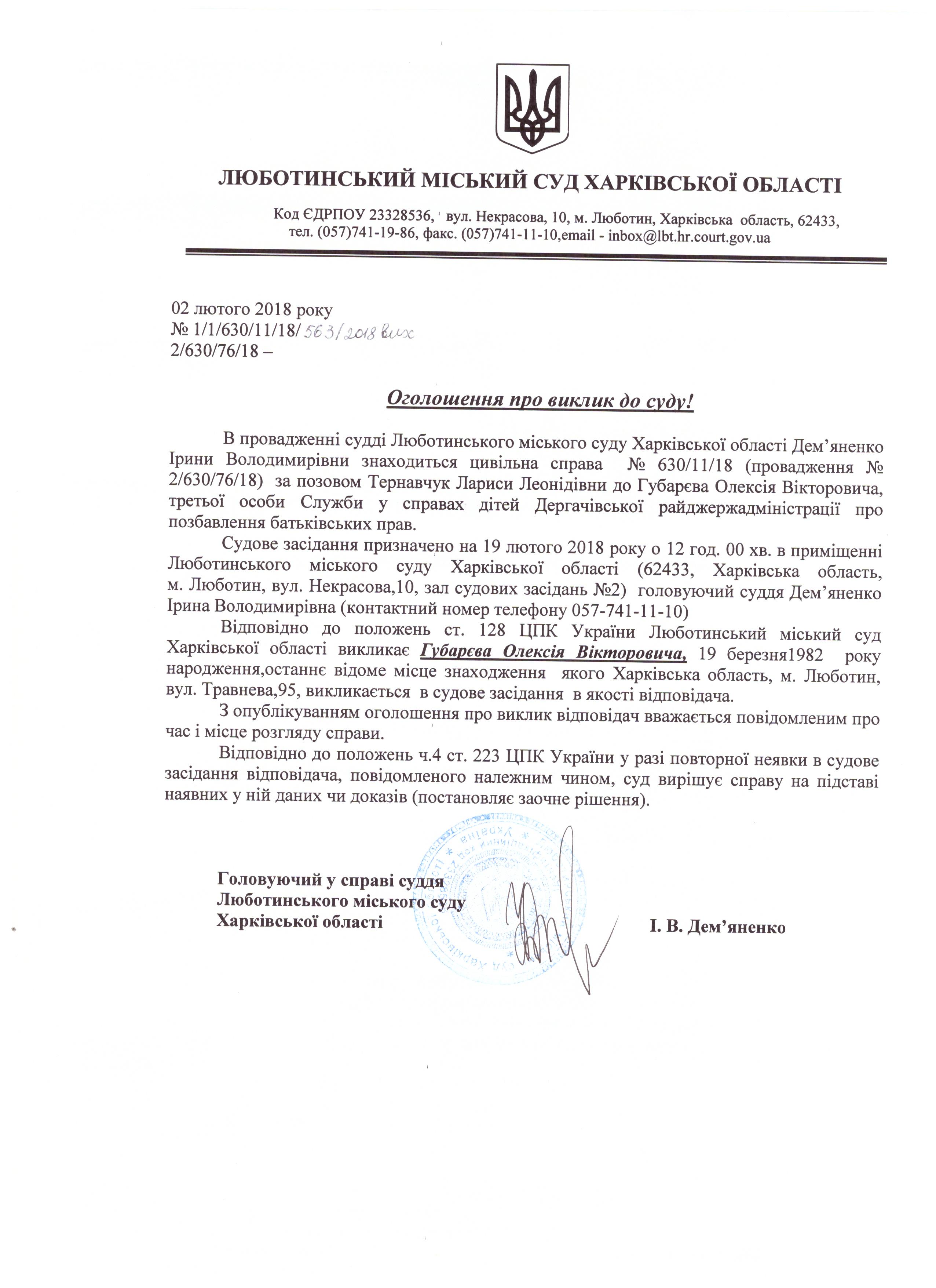 Оголошення про виклик до суду Губарєва Олексія Вікторовича на 19.02.18 о 12-00