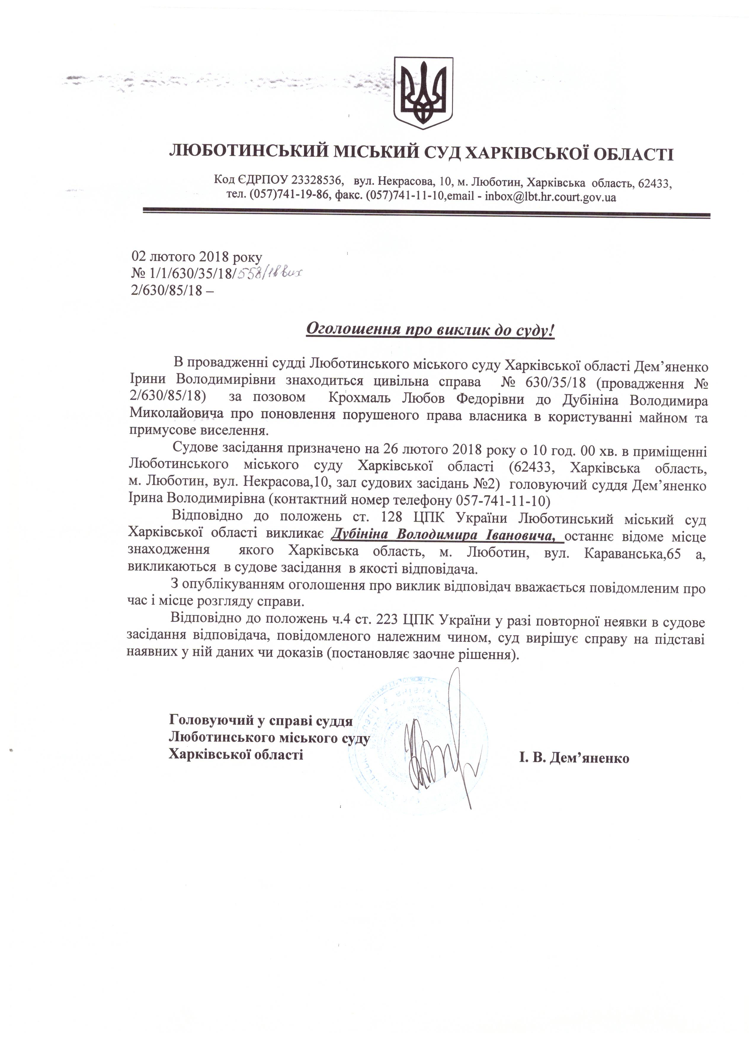 Оголошення про виклик до суду Дубініна Володимира Івановича на 26.02.18 о 10-00