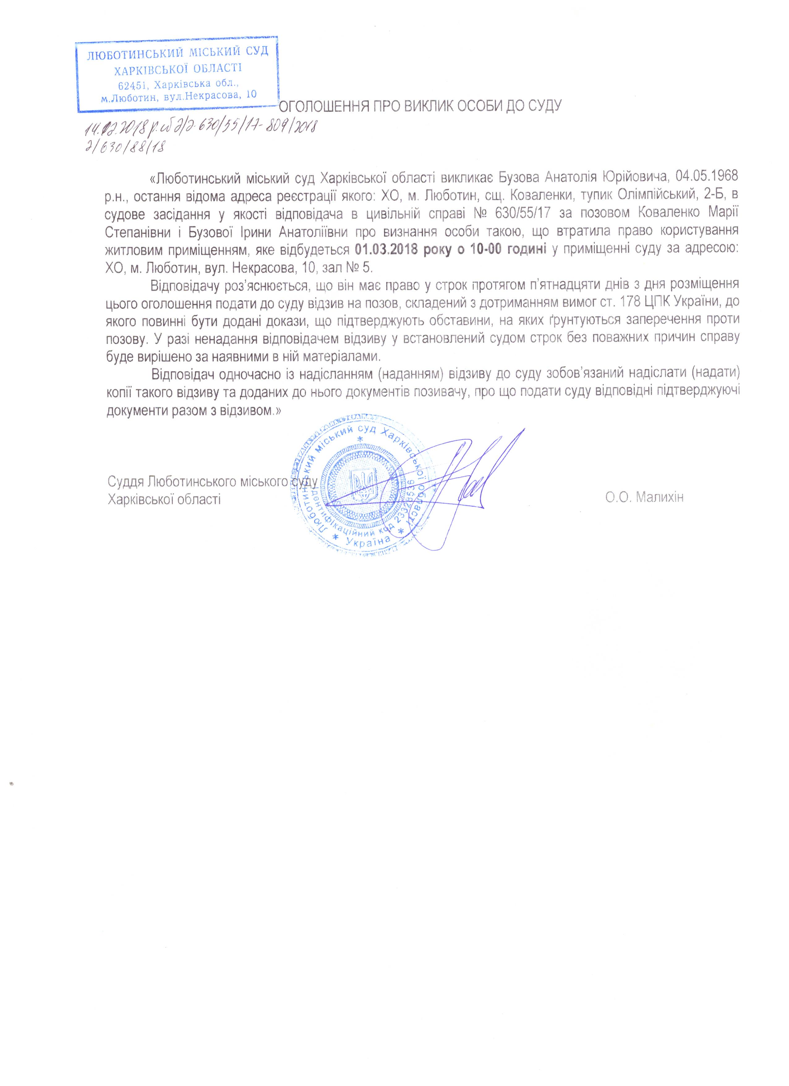 Оголошення про виклик до суду Бузова Анатолія Брійовича на 01.03.2018 о 10:00