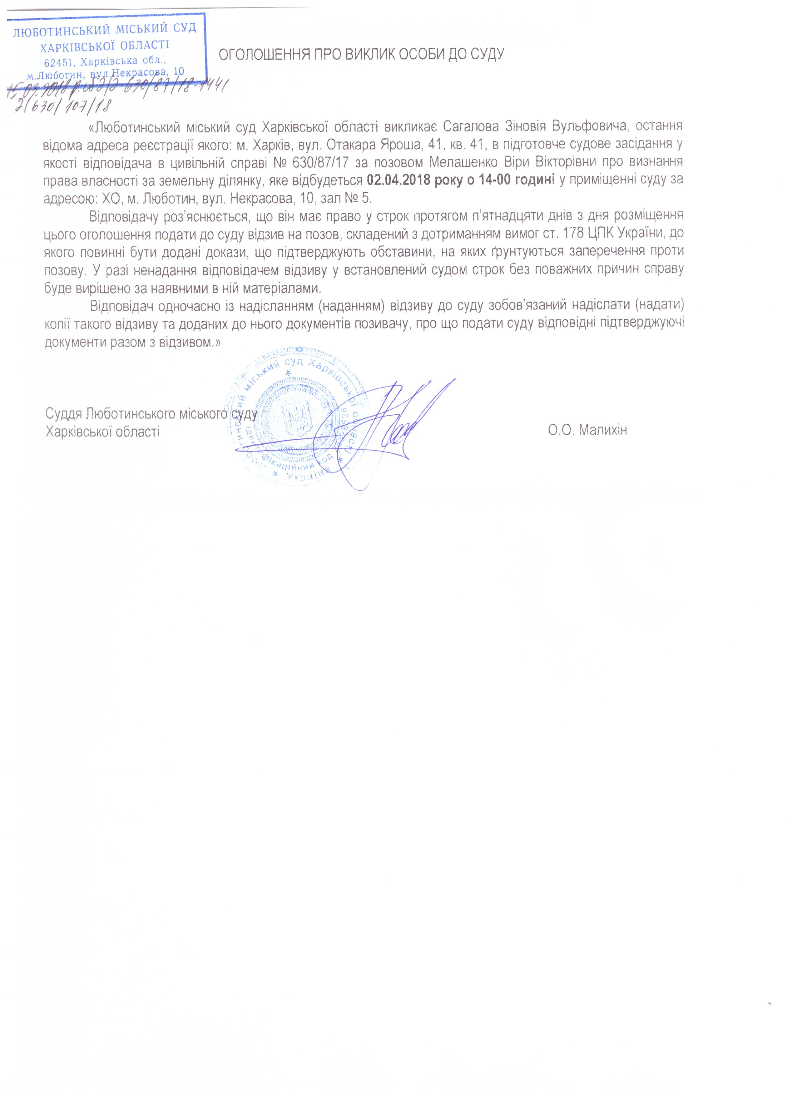 Оголошення про виклик до суду Сагалова Зіновія Вульфовича на 02.04.2018 року о 14-00