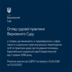 Пропонуємо ознайомитися з Оглядом судової практики Верховного Суду у спорах, що виникають із правовідносин у сфері захисту соціальних прав внутрішньо переміщених осіб та практики щодо застосування положень Європейської соціальної хартії (переглянутої) від 3 травня 1996 року.