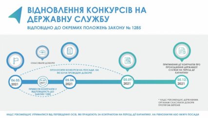 Конкурси на посади державної служби, що обіймають особи, з якими укладені контракти на період дії карантину, мають бути оголошені протягом 6 місяців з дня набрання чинності вищезазначеного Закону, тобто, до 5 вересня 2021 року включно. В той час як контракти про проходження державної служби на період дії карантину діють впродовж 9 місяців, тобто не довше, ніж до 5 грудня 2021 року включно.