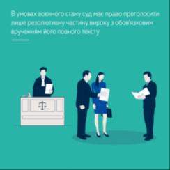 В умовах дії воєнного стану суд, склавши та підписавши повний текст вироку, має право проголосити лише його резолютивну частину з обов’язковим врученням учасникам судового провадження повного тексту вироку в день його проголошення.