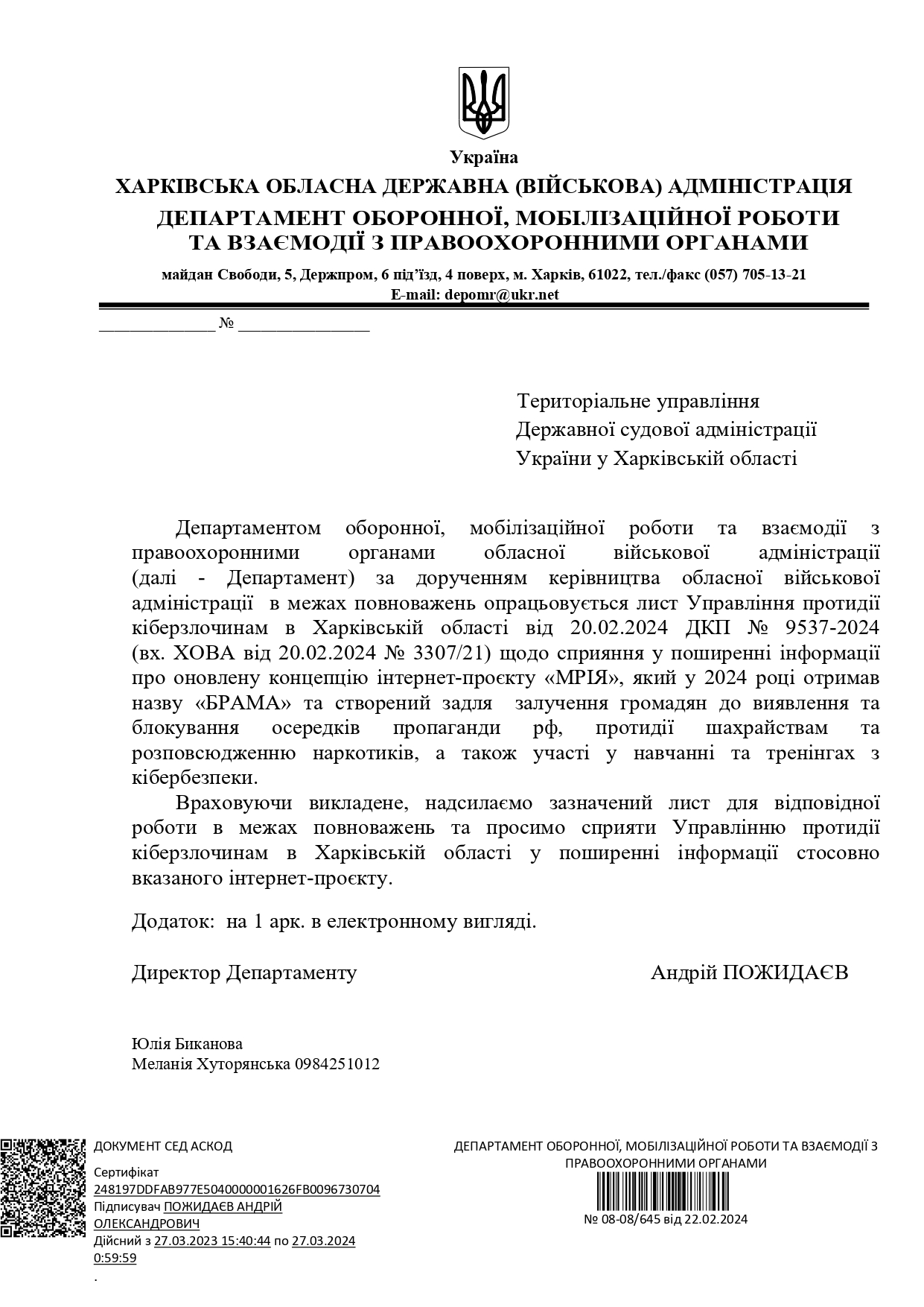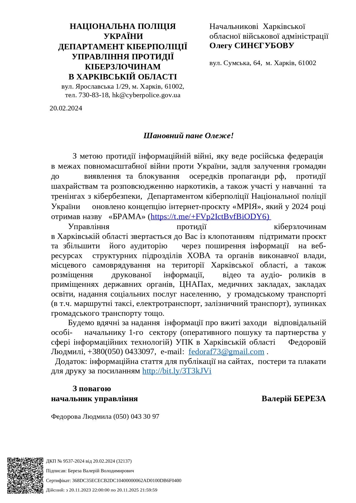 З метою протидії інформаційній війні, яку веде російська федерація в межах повномасштабної війни проти України, задля залучення громадян до виявлення та блокування осередків пропаганди рф, протидії шахрайствам та розповсюдженню наркотиків, а також участі у навчанні та тренінгах з кібербезпеки, Департаментом кіберполіції Національної поліції України оновлено концепцію інтернет-проєкту «МРІЯ», який у 2024 році отримав назву «БРАМА» ( https://t.me/+FVp2IctBvfBiODY6 )