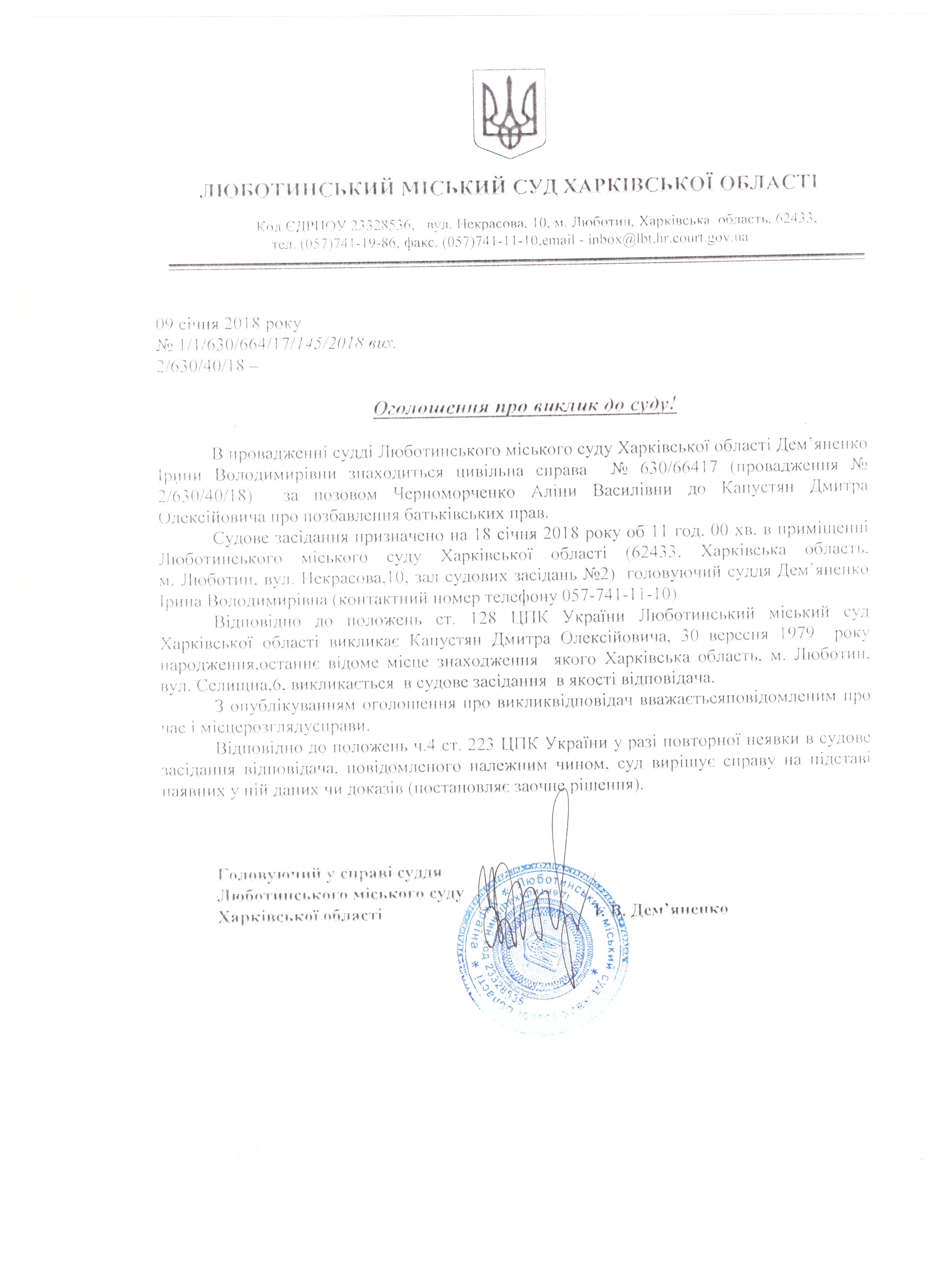 Оголошення про виклик до суду Капустян Дмитра Олексійовича