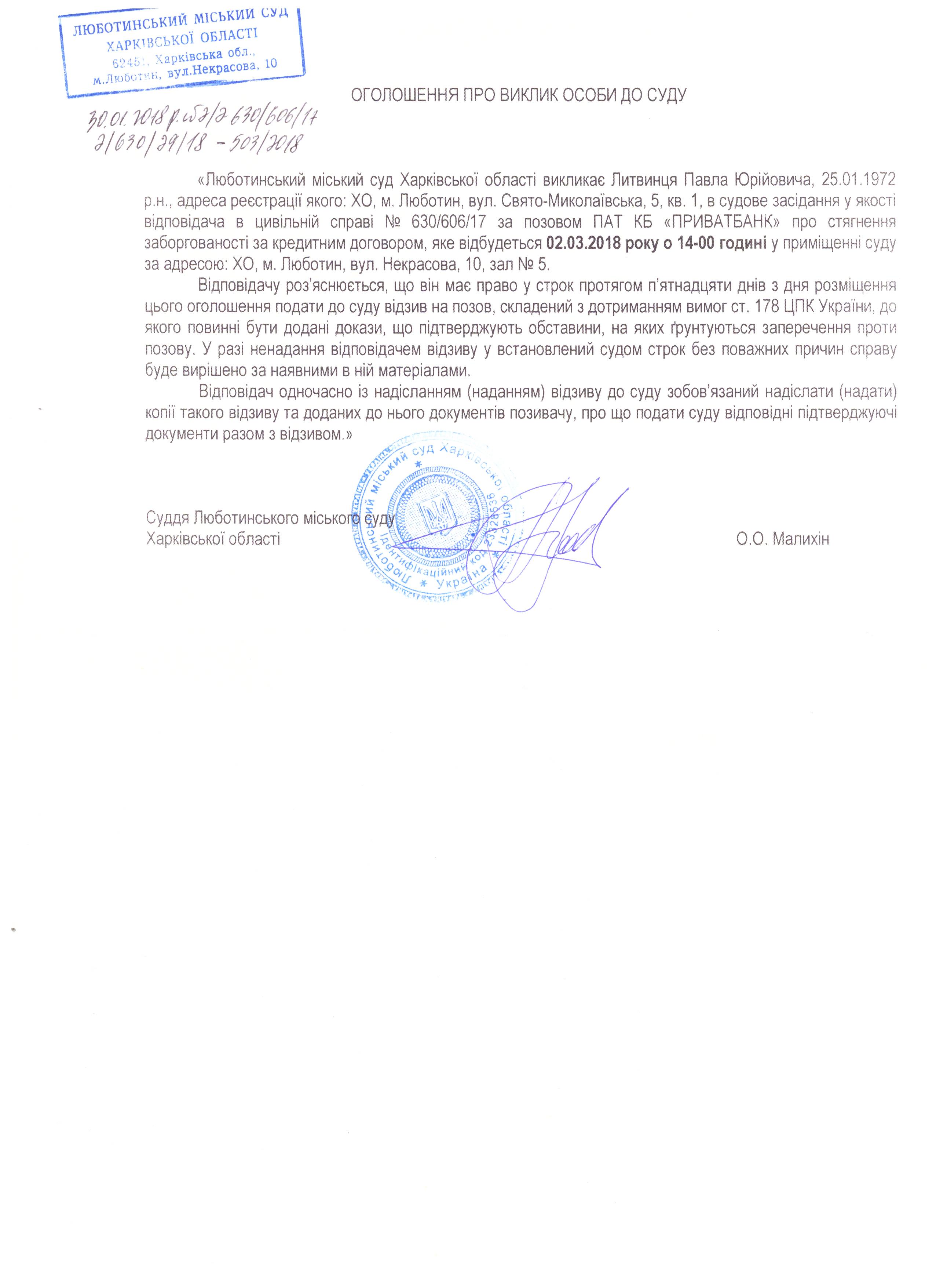 Оголошення про виклик до суду Литвинця Павла Юрійовича