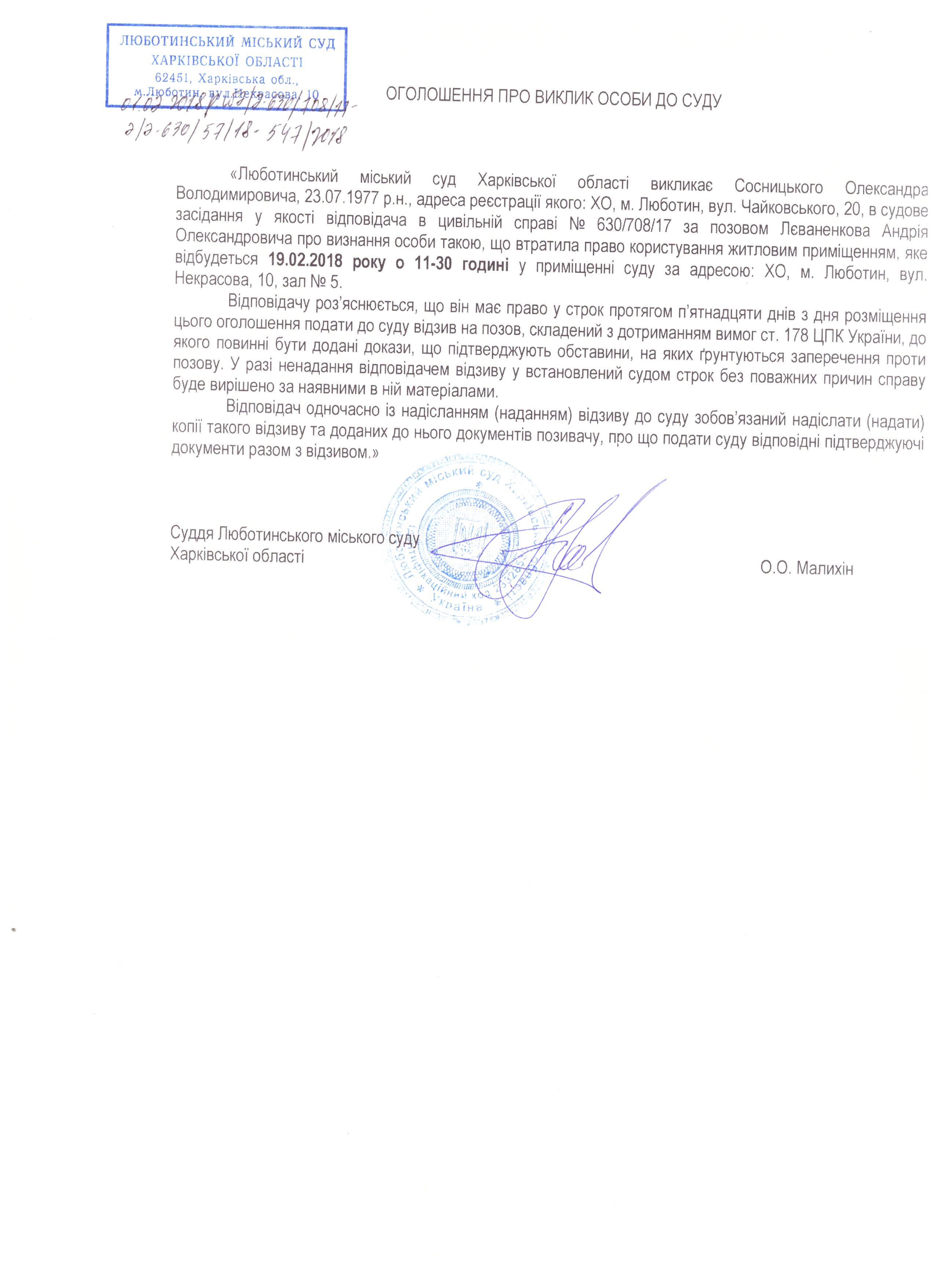 Оголошення про виклик до суду Сосницького Олександра Володимировича