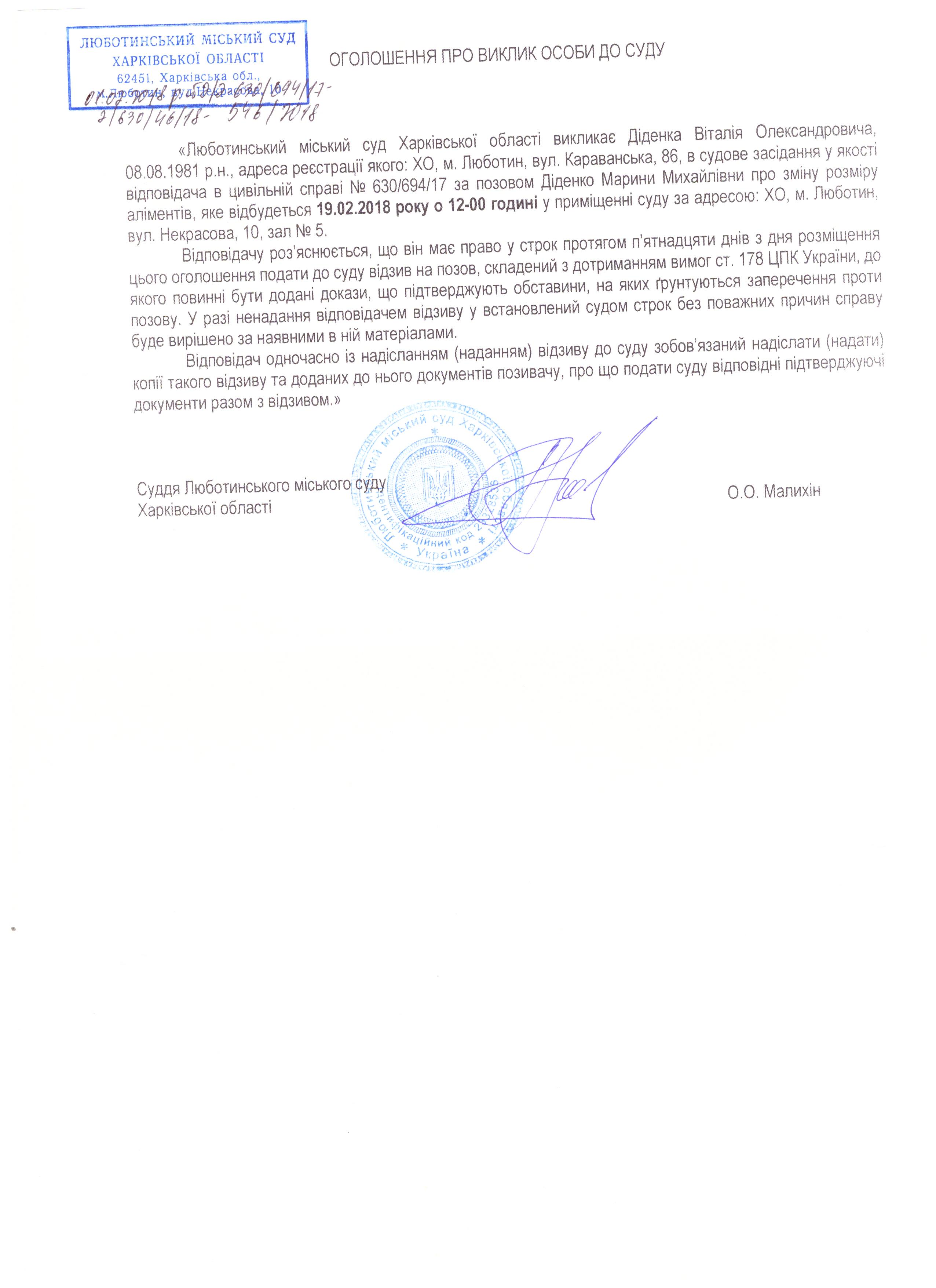 Оголошення про виклик до суду Діденка Віталія Олександровича