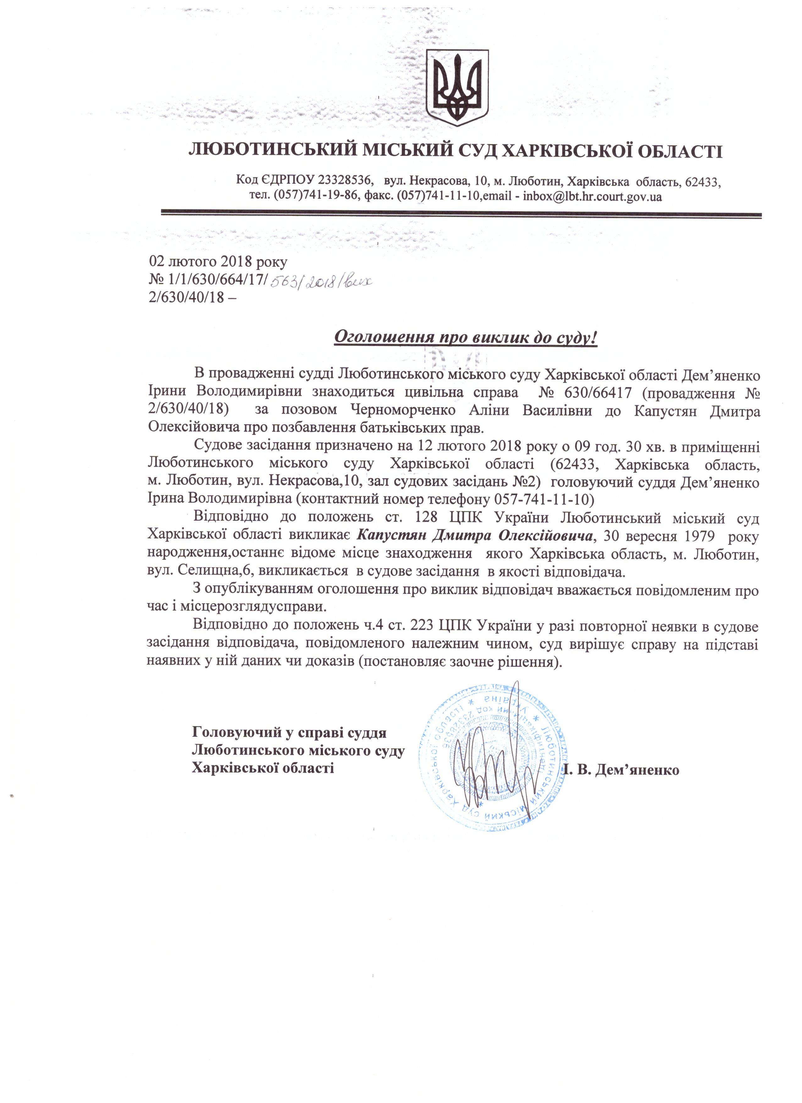 Оголошення про виклик до суду Капустян Дмитра Олексійовича на 12.02.2018 о 9-30 год.
