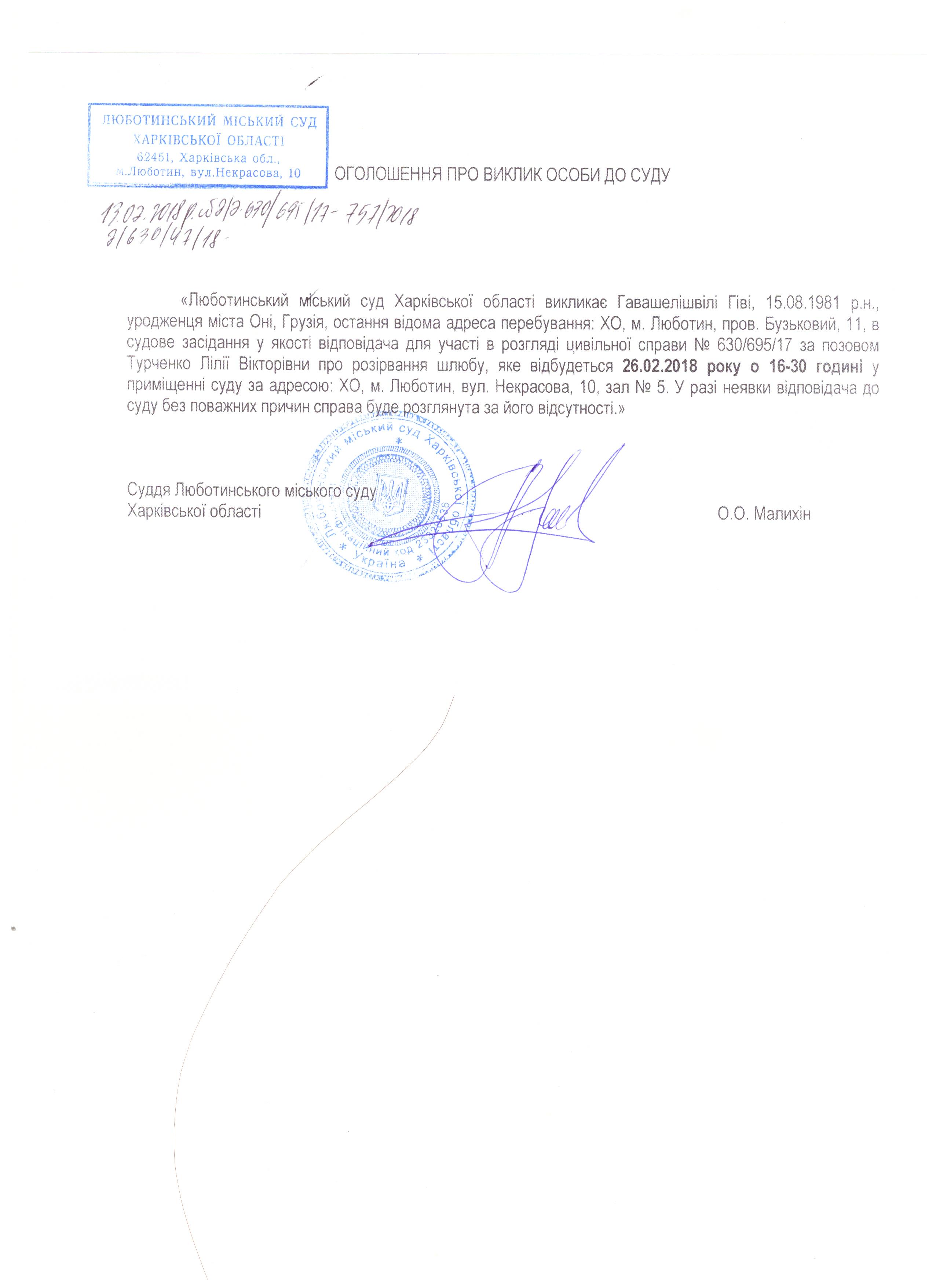 Оголошення про виклик до суду Гавашелішвілі Гіві на 26.02.2018 на 16:30