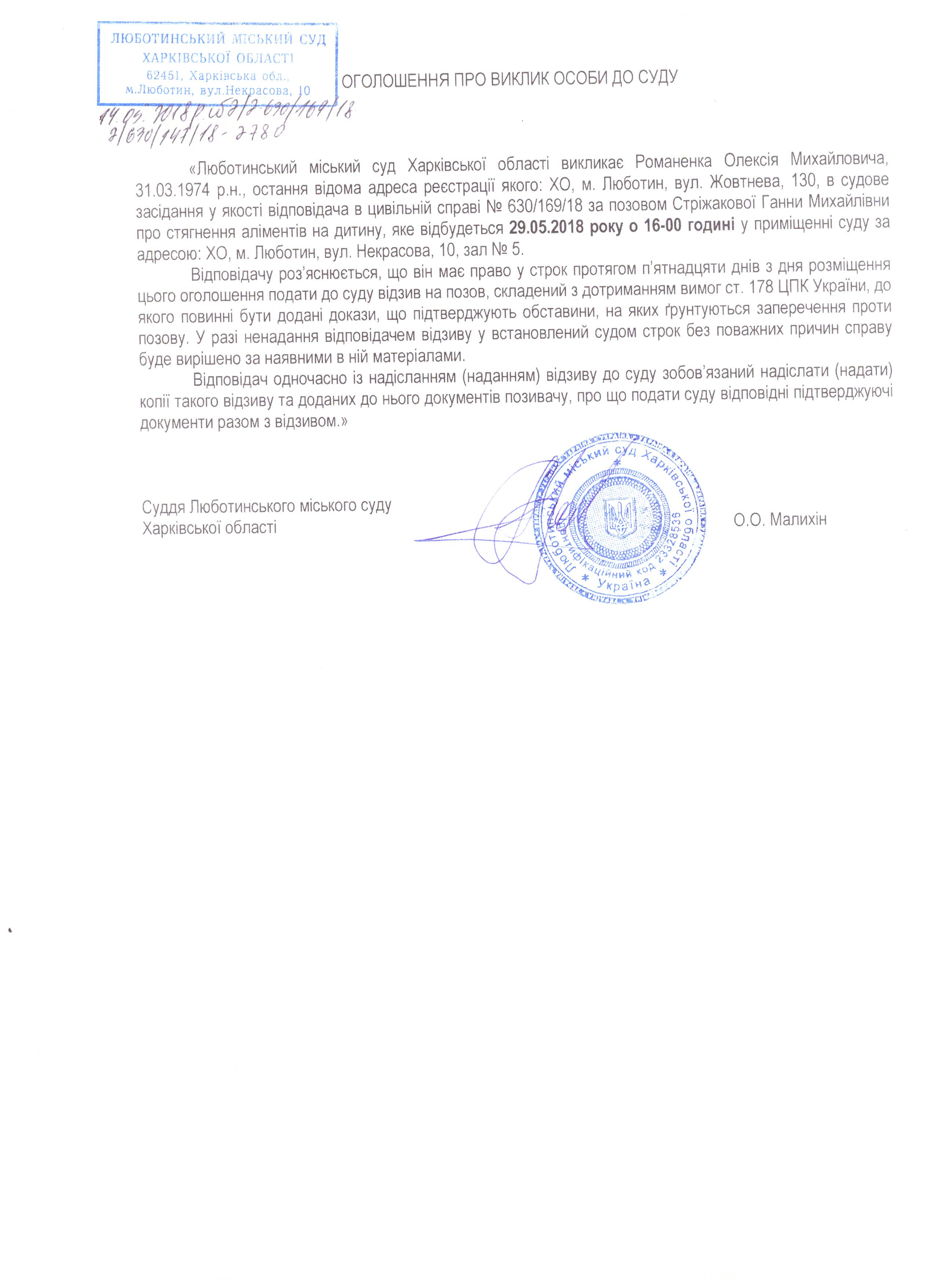 Оголошення про виклик до суду Романенка Олексія Михайловича на 29 травня 2018 року о 16-00 год.