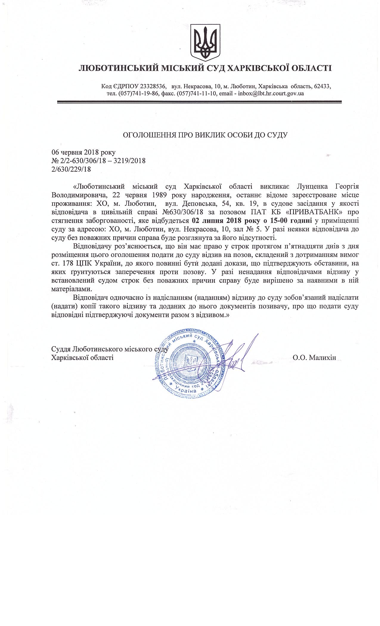 Оголошення про виклик до суду Лунценко Георгія Володимировича на 02 липня 2018 року о 15-00 год.