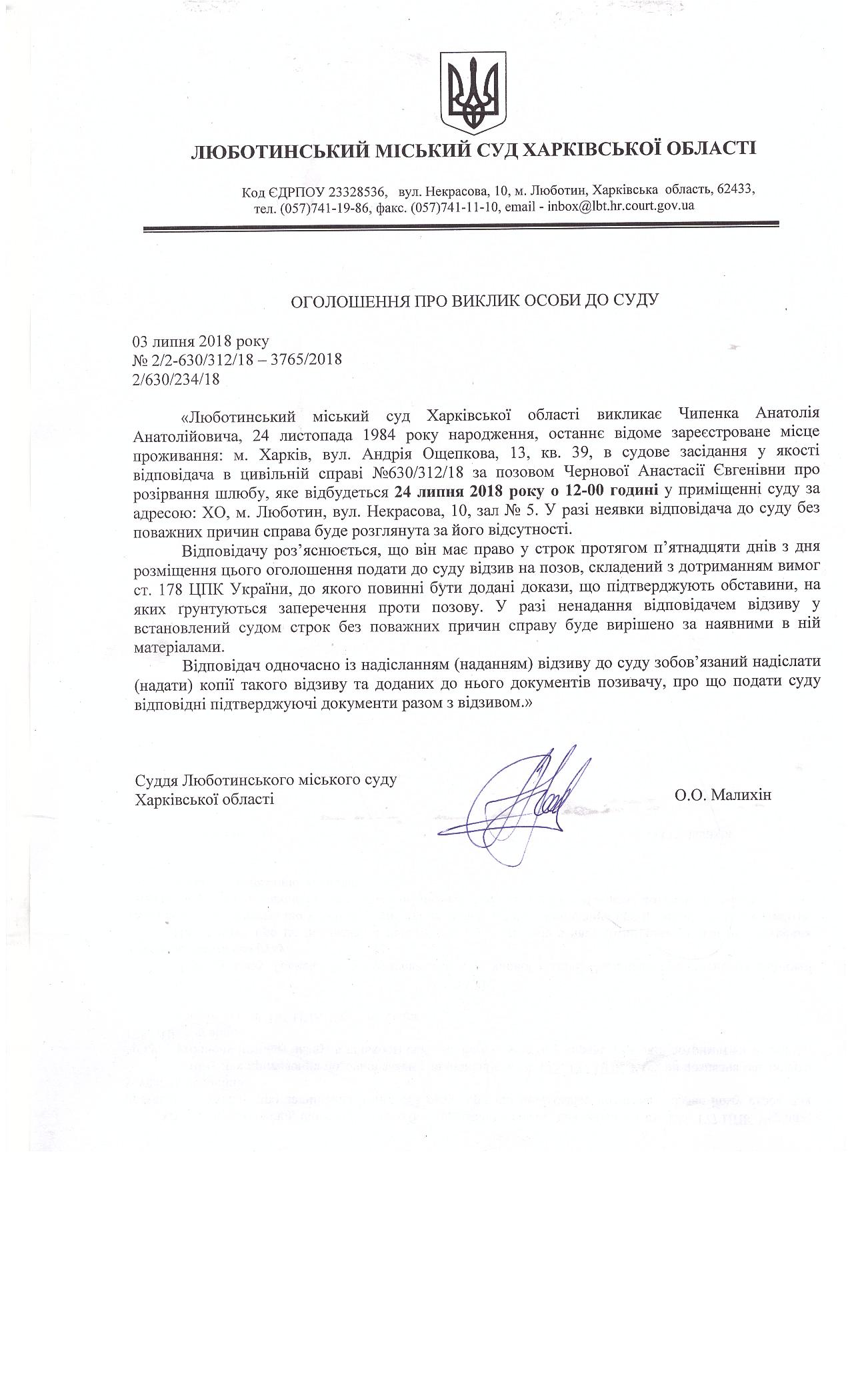 Оголошеня про виклик до суду Чипенка Анатолія Анатолійовича на 24 липня 2018 року о 12-00 год.