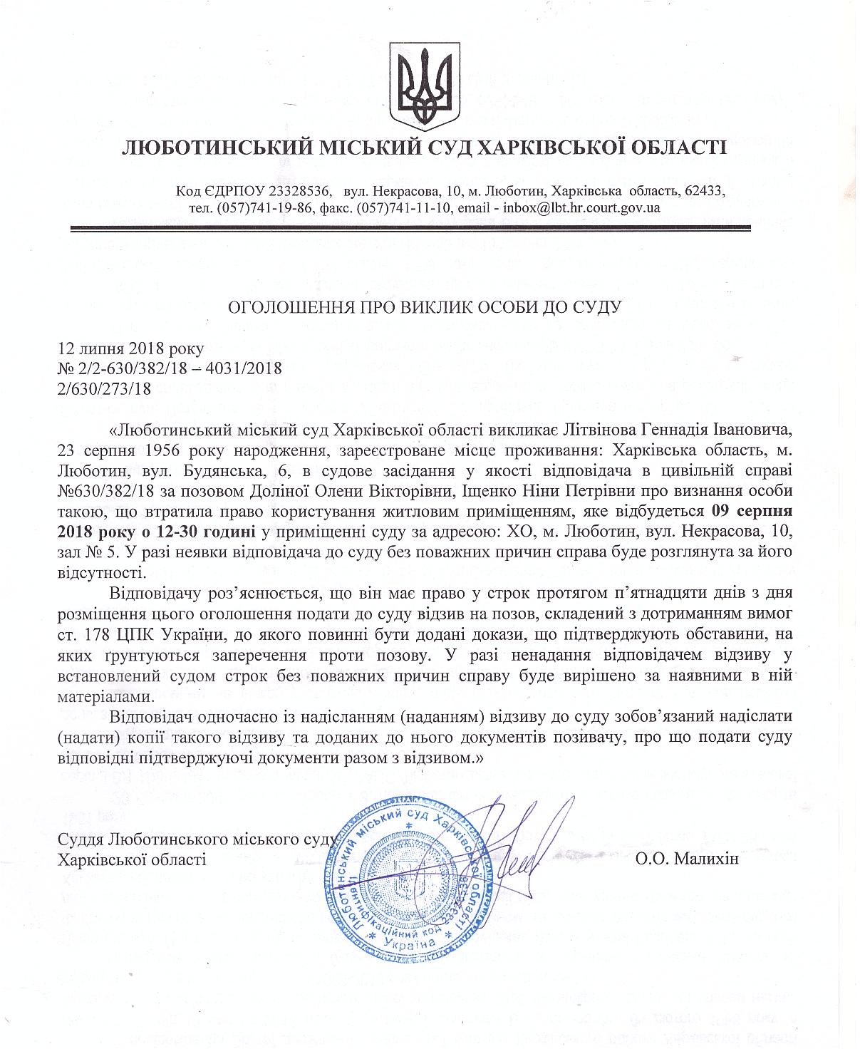 Оголошеня про виклик до суду Літвінова Геннадія Івановича на 09 серпня 2018 року о 12-30 год.