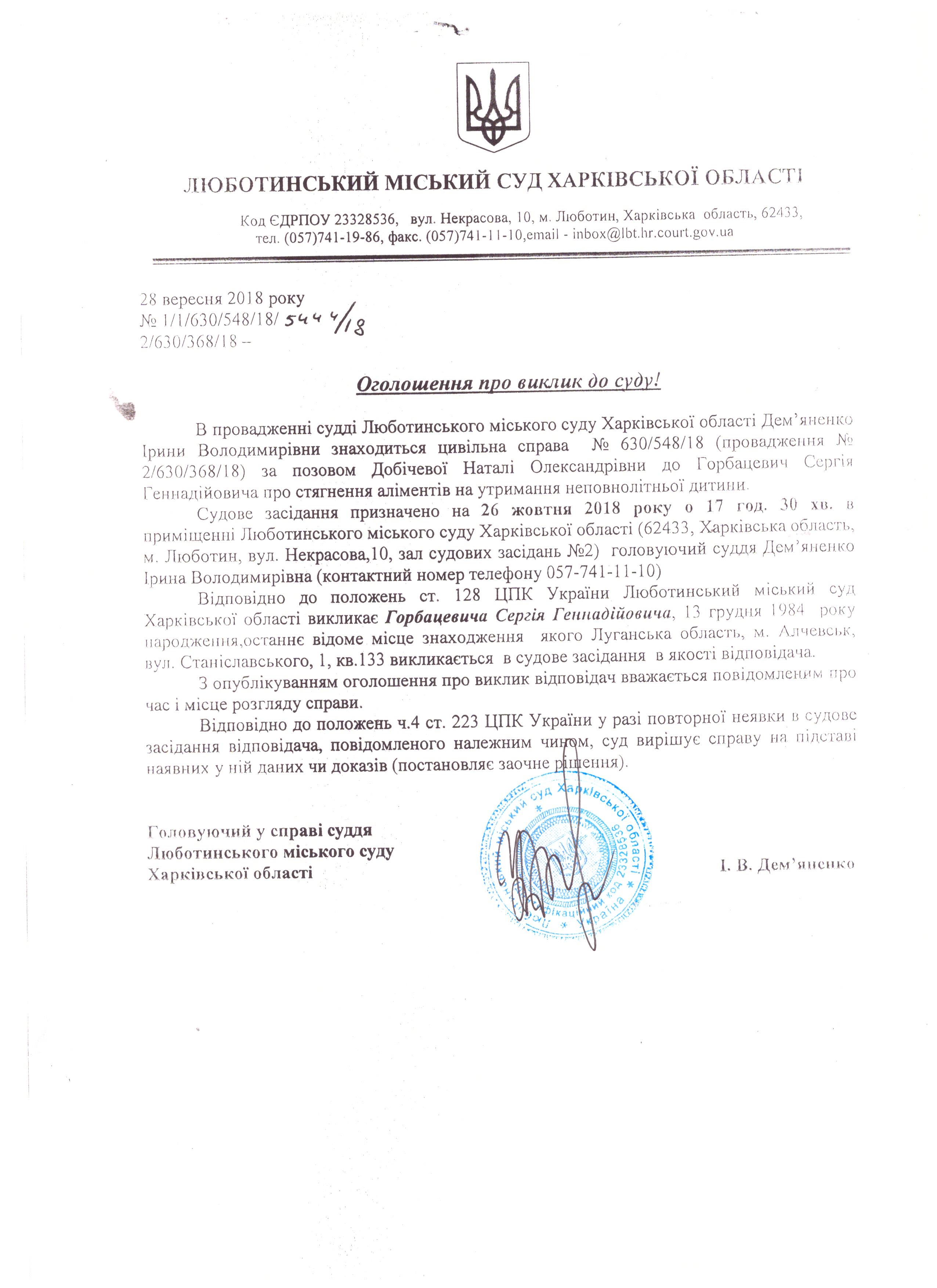 Оголошення про виклик до суду Горбацевича Сергія Геннадійовича на 26 жовтня 2018 року о 17-00 год