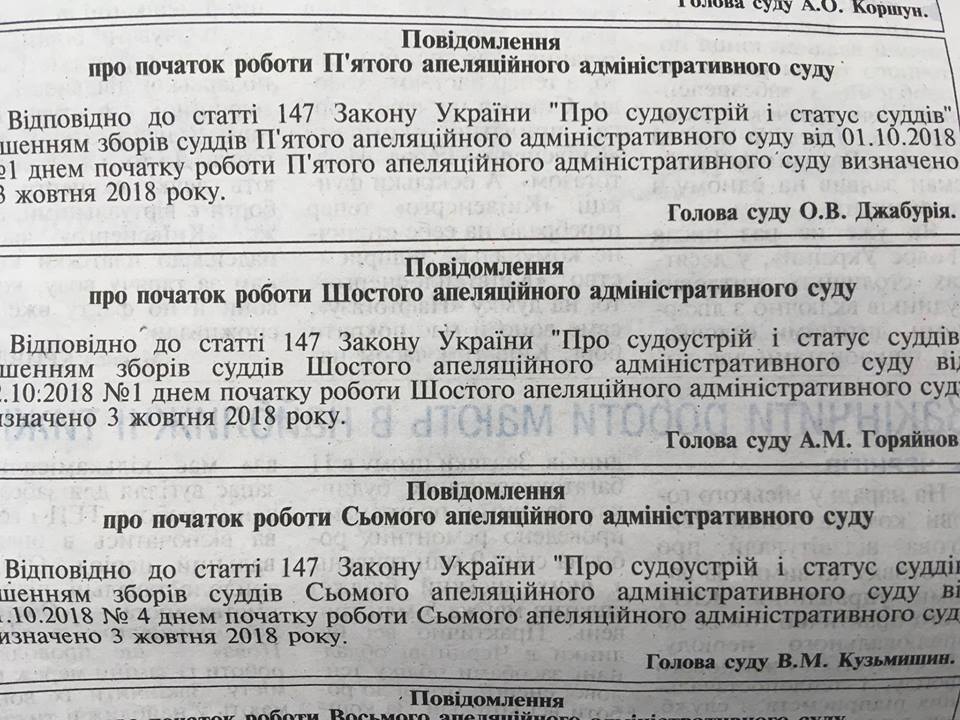 Відповідне повідомлення опубліковано головою новоутвореного суду Олександром Джабурія в газеті "Голос України".