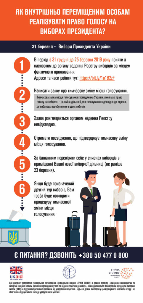 31 грудня офіційно розпочався прийом заяв про тимчасову зміну місця голосування без зміни виборчої адреси. Цією процедурою можуть скористатися переселенці, які бажають взяти участь у виборах. Насамперед потрібно знайти адресу найближчого органу Державного реєстру виборців за місцем перебування в день виборів або місцем реєстрації як внутрішньо переміщеної особи (ВПО). Всі адреси опубліковані на сайті drv.gov.ua. Потрібно взяти паспорт і піти написати заяву про зміну місця голосування. Зробити це можна не пізніше, ніж за 5 днів до виборів, а саме до 25 березня.